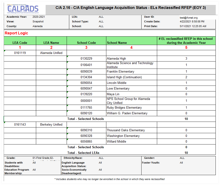 | 5 | Count of students whose English Language Acquisition Status was changed from EL to RFEP at the selected school during the Report Period (July 1 – June 30). |