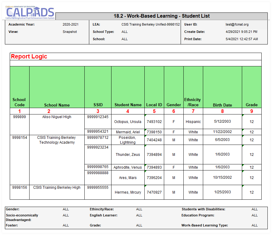 Look for SSID Enrollment (SENR), Student Information (SINF) and Work-Base Learning (WBLR) tabs for the fields indicated in the report logic.