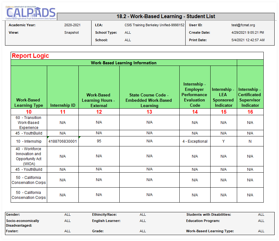 - Work-Based Learning (WBLR) records in the selected Academic Year (Field 21.07) at the School of Attendance (Field 21.05) from the Enrollment record