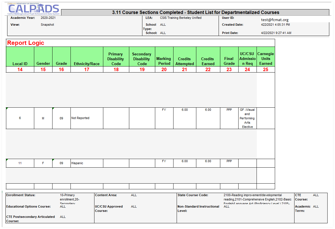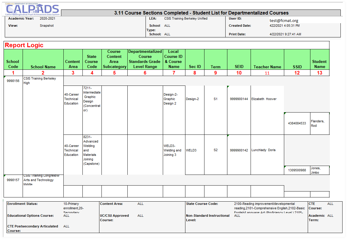 Report 3.11 - Course Sections Completed - Student List for Departmentalized Courses¶